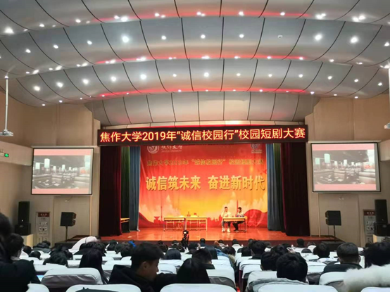 为加强学生资助政策、征信知识和金融基础知识普及宣传教育,培养广大学生诚实守信、知恩感恩、自立自强的良好品质,12月20日下午,由学生处主办的 “诚信校园行”校园短剧大赛决赛在南校区报告厅圆满举行。各学院学工办主任,辅导员老师及300余名学生共同观看了本次比赛。