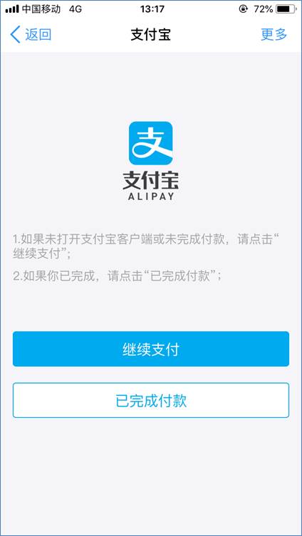 9. 如果未打开支付宝客户端或未完成付款,点击【继续付款】